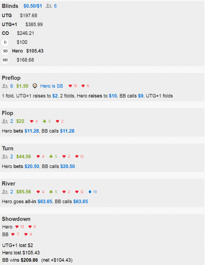 Hero showed Qc 8c and lost (-$2.03 net)