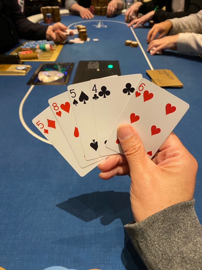 Fem kort i hulen og man må trække 3 gange. Vi har trukket to gange så et træk tilbage. Vi er 3-ways og der bettes $12 efterfulgt af et call. Jeg kan complete med et call hvor der så vil være $126.
