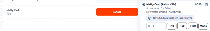 Så kan jeg da endelig slippe af med mit kæp-heste-spil på Matty Cash - scorer fra udenfor feltet, når ikke kan få minimumsindsatsen på 1 kr. på det spil.....jøsses Betano.