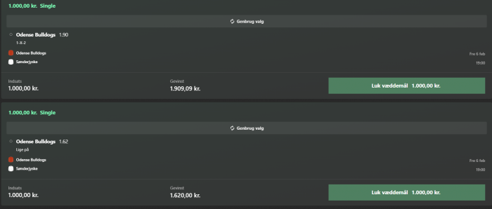 OB - F.C. København Vundet (+3.85 units) Over 2,5 mål + begge hold scorer @ odds 2.1 3.5 / 5 Bet365 Fodbold - Danmark - Superligaen - 21/02-2026 14:00 Synes det er et rigtigt fint spil på en målrig affære i det fynske lørdag eftermiddag.