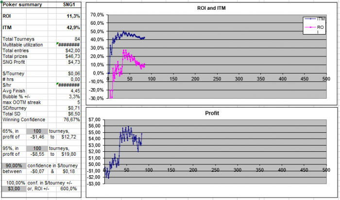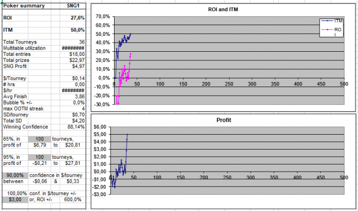 Online har jeg haft et par fornuftige (efter min målestok) wins og cashes, men når alt kommer til alt, er det sit and go’s, jeg har brugt mest tid på og hvor jeg har gjort det bedst over længere perioder. Jeg var regular på $50-$100 på Ongame netværket og gjorde det godt i lang tid. Desuden har jeg gennemført et par succesfulde stakingdeals bl.a. denne fra 2010.