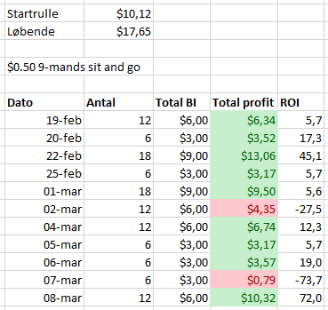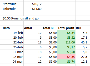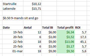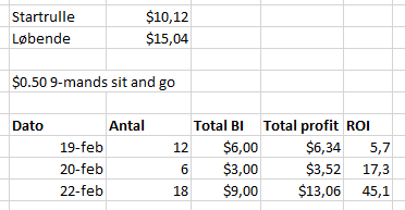 Så de ca. $10 jeg har stående på Pokerstars skal ud at arbejde. Og de skal vokse sig større i de gode gamle 9-mands sit and go’s. Og da de tilsyneladende ikke findes til under $0.50, må det være der, jeg starter på trods af den store risiko for at buste. Jeg er selvfølgelig godt klar over at de spil ikke er, hvad de har været, og da der ikke kom nogle svar i min tråd i går, tolker jeg det som om, interessen for dem efterhånden er minimal.