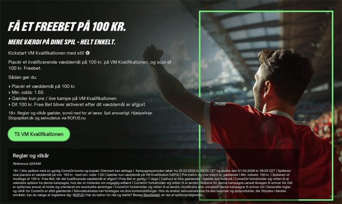 18+ | Alle spillere med en gyldig ComeOn-konto og bopæl i Danmark kan deltage | Kampagneperioden løber fra 25.03.2026 kl. 08.00 CET og slutter den 01.04.2026 kl. 09.00 CET | Spilleren skal placere et væddemål på min. 100 kr. med min. odds 1.50 | Gælder kun væddemål på VM Kvalifikation (UEFA) | Pre-match og Live match er gældende | Min. indsats: 100 kr. | Spilleren vil modtage et 100 kr. Free Bet, når det kvalificerede væddemål er afgjort | Free Bet er gyldig i 7 dage | Cashout er ikke gældende | Gælder kun fodbold | ComeOn! forbeholder sig retten til at udelukke spillere fra denne kampagne, hvis der er mistanke om svigagtig adfærd | ComeOn! forbeholder sig retten til at ændre vilkårene for denne kampagne uanset årsagen til enhver tid. Det er spillernes ansvar at holde sig orienteret om eventuelle ændringer | ComeOn! forbeholder sig retten til at ændre, modificere eller annullere denne kampagne til enhver tid | Generelle regler og vilkår for ComeOn er altid gældende | Selvudelukkelse kan foretages via dine kontoindstillinger. Hvis du ønsker selvudelukkelse fra alle kasinoer og spilprodukter, der tilbydes i danske områder, kan du vælge at registrere dig i ROFUS | Har du behov for råd og støtte? Besøg StopSpillet, en del af spillemyndigheden.