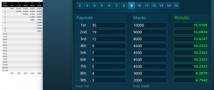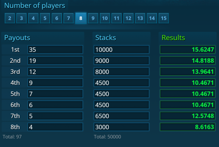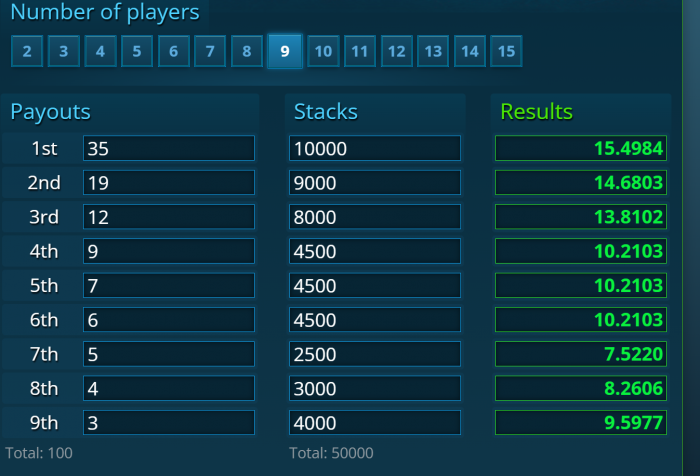 Nedenstående er for 50 spillere der hver giver 4$ for 1000 chips. Penge til 9.