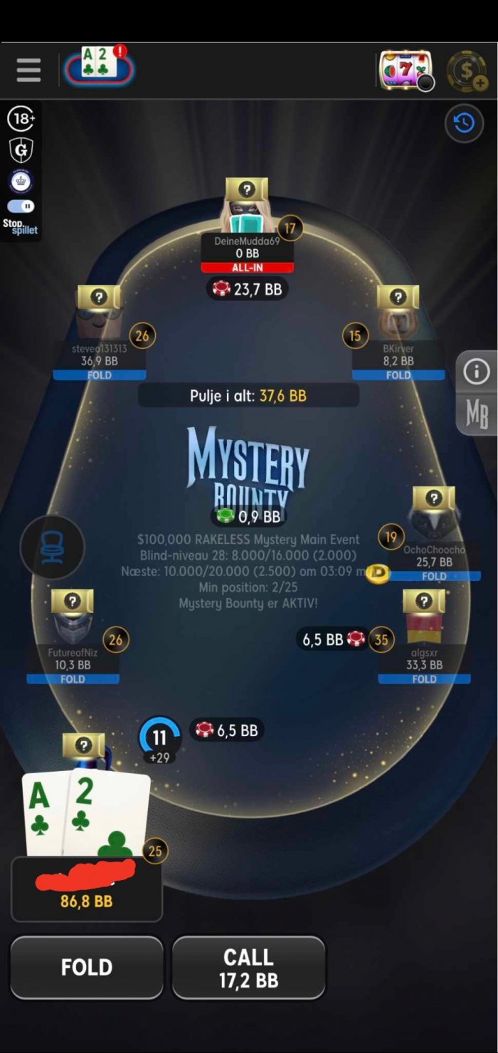 Overvejer spiller 7 nu at kalde all in fra spiller 9 kan han gøre ingenting og forvente at vinde 10.2 (og evt bounties)