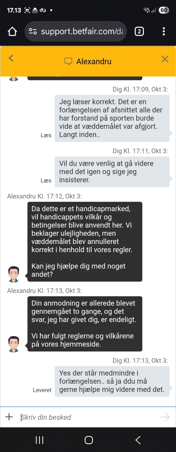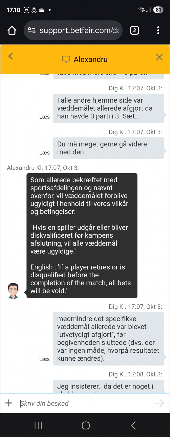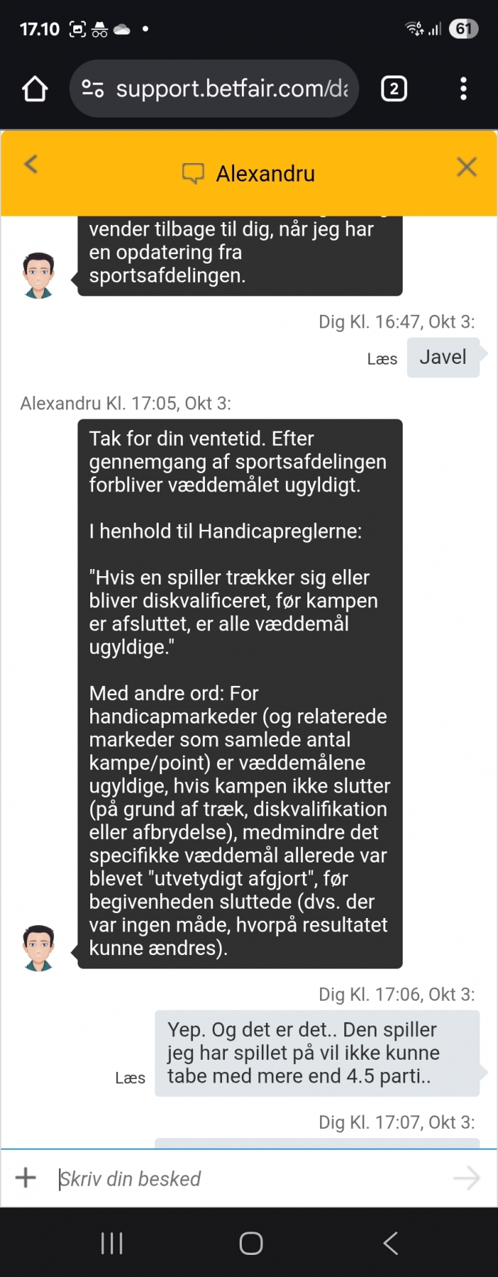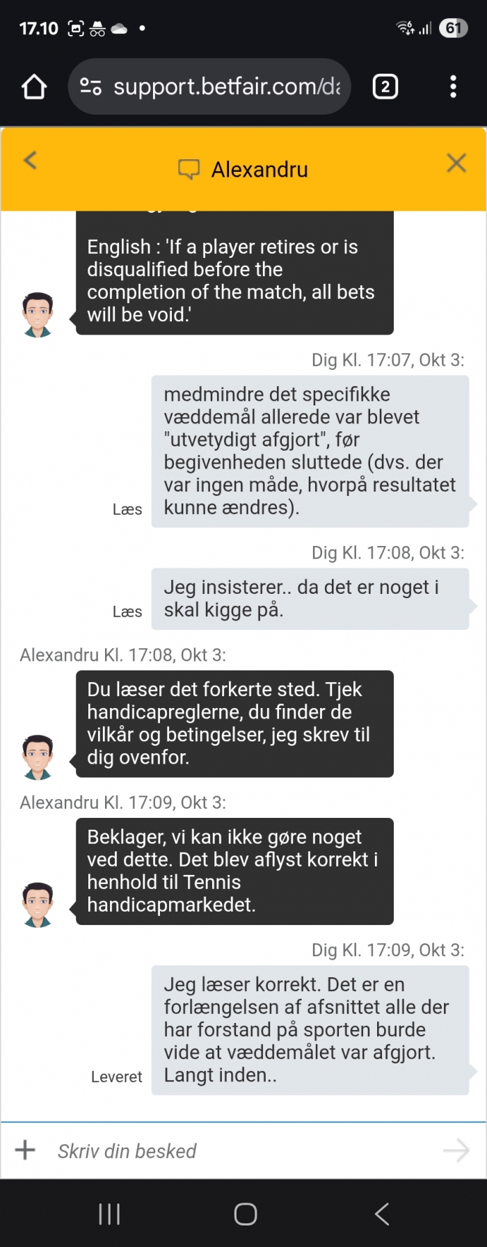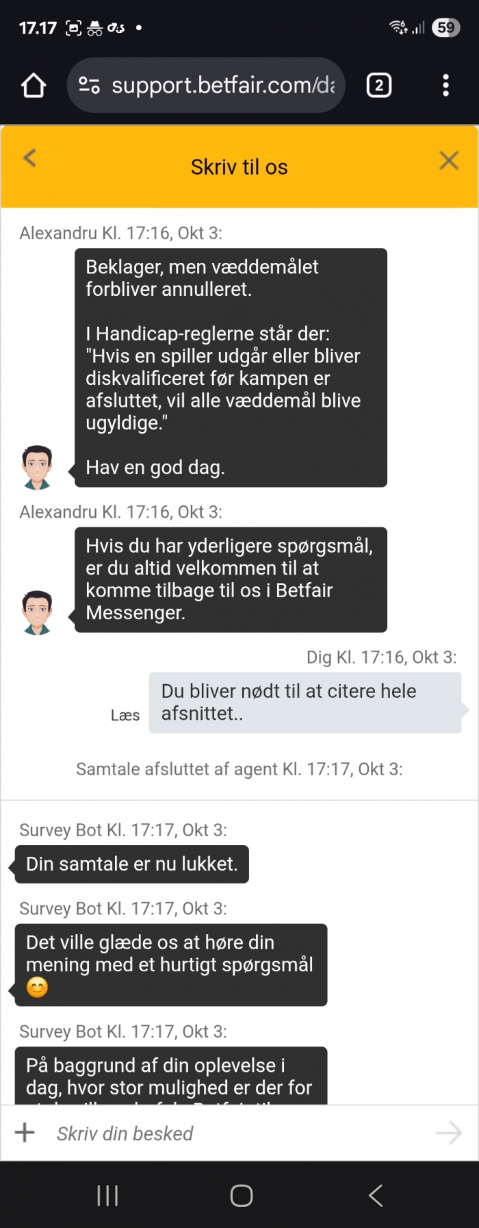 Send en mail til dem på engelsk, hvor du skriver "Complaint: Bet nr XXX" i emnefeltet. Så skulle der være en af deres mere erfarne supportere/Team leads, som kigger på det. Brug argumentationen, som Flinkfyr brugte og tilføj, at det er en kamp som spilles bedst af 3 sæt og ikke 5 sæt. Er meget muligt, at deres support ikke har fanget, at der spilles bedst af 3 sæt. Redigeret af Taanlane d. 04-10-2025 08:28