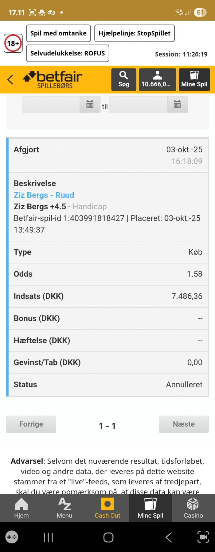 Forstår ikke hvorfor du mener at bettet var "utvetydig afgjort". Casper Ruud kunne vel have vundet 3. sæt 6-4 og 4. sæt 6-0 (hvis han var i stand til at fortsætte), og så er dit væddemål vel tabt?