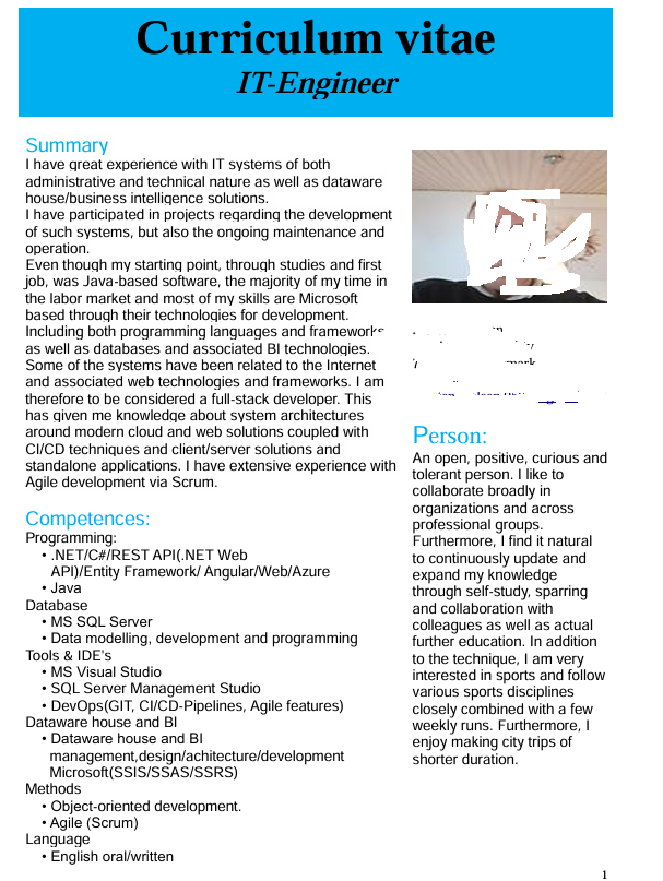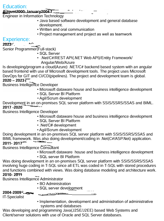 SummaryExperienced IT professional with a strong background in both administrative and technical systems, coupled with a focus on data warehouse and business intelligence solutions. Proven track record in developing, maintaining, and operating IT systems, with a diverse range of skills in Microsoft technologies, programming languages, frameworks, and databases.Started my career with Java-based software development and subsequently specialized in Microsoft technologies, becoming proficient in full-stack development. Skilled in modern cloud architectures and web solutions, with hands-on experience in CI/CD practices. Adept at Agile development methodologies, particularly Scrum, which has enhanced my ability to deliver high-quality software solutions efficiently.