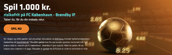 Nye spillere, der opretter sig via kampagnelinket nedenfor, kan spille 1.000 kr. risikofrit på FC København - Brøndby IF i dag (23. november 2025).