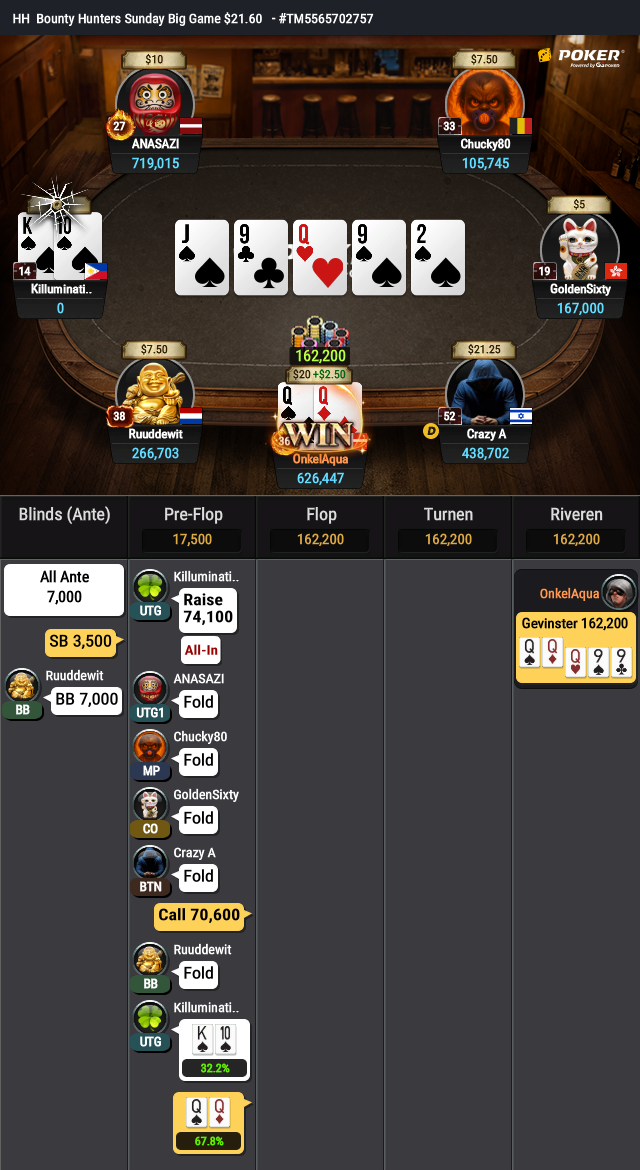 Kom til at missclicke med 20K på river. Men han går all in og jeg tager puljen :D