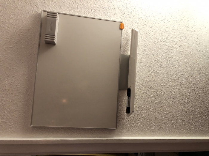 De 2 aflange ophæng er det rammen skal hænge i. Du skruer dem i væggen så de danner en "kant" rammen kan hænge i, de skal opsættes i samme niveau/højde, brug et vaterpas hvis du har et. De 2 små stykker sættes så de kan fange de 2 "gribere" der sidder i siderammerne. Det er så whiteboarded holdes ind til væggen, og ikke falder ned ved aftøring o.lign. De 2 "gribere" i siderammen er flytbare så her er det ikke så vigtigt, at de 2 stykker sidder nøjagtig udfor hinanden, de skal bare passe ca. med rammens bredde. Du hænger boarded op, og kan glide de 2 sidestykker på plads bagefter. Det er mit bud, lidt svært at bedømme helt udfra billedet, men det er ca. noget i den stil.