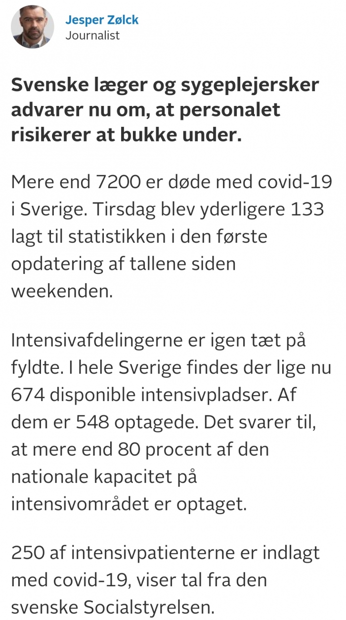 "Svenskere har håndteret det videnskabeligt korrekt (tragisk nok begik de store fejl i starten, da man ikke tog nok hånd om plejehjem og plejeboliger samt de somaliske grupper, hvilket de svenske myndigheder selv har erkendt og undskyldt over"