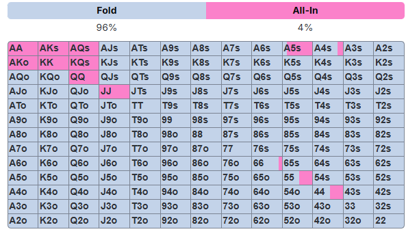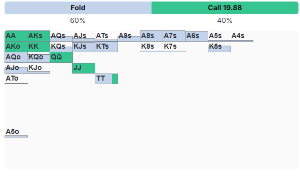 Det her er hans range iflg solver i symetrisk 25bb deep. Men eftersom UTG åbner fra 11bb bør hans range være endnu mere stram og han bør ikke have så mange bluffs som han har her. men selv med den her range så er TT overvejende et fold iflg solver.