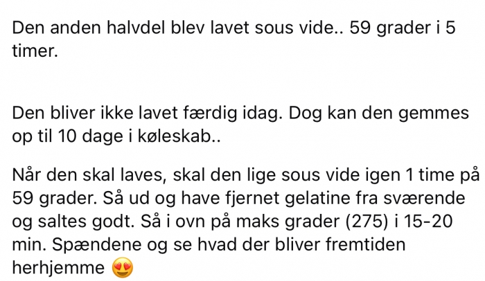 Sous vide den på 59 grader og fem timer hvorefter den slukker og stegen bliver liggende i 3-4 timer i vandet inden jeg kommer hjem d. 23. Tager den ud af plastik og overhælder med kogende vand for derefter at salte svær. Dupper den og sætter den ind i køleskabet natten over uden den er dækket til.