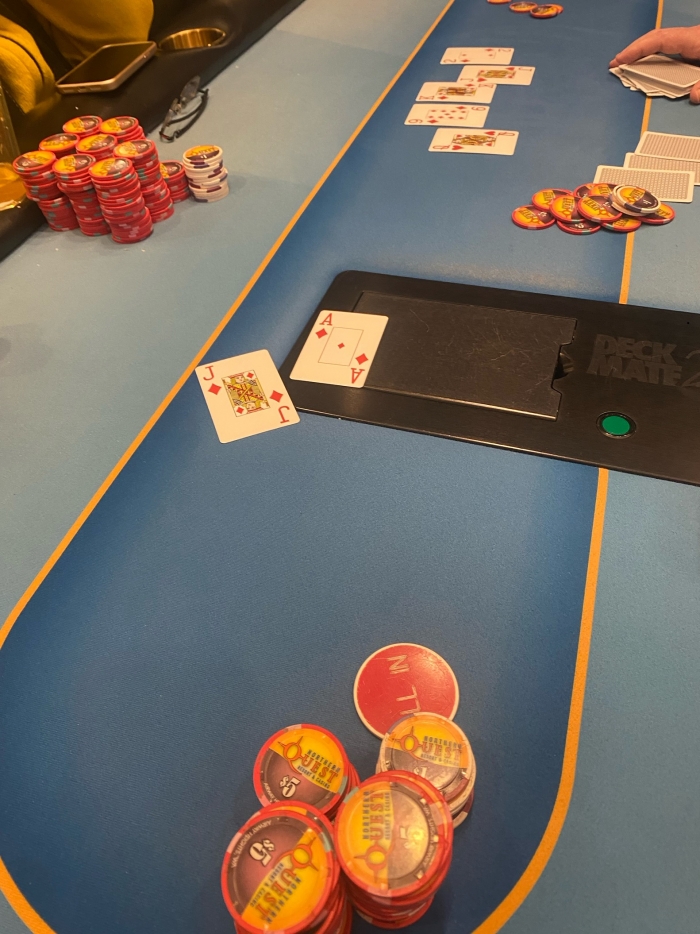 Jeg har straddled $6 UTG. UTG2 limper. Spurs er next og raiser til $50 med $170 bag. Det bliver min tur som jammer med A♦K♠. Han caller med A♠Q♥ og jeg holder! Jeg buster Spurs for 3. gang idag. Vi fistpumper og han forlader os.