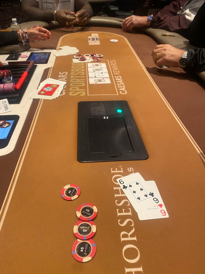 First dealt hand. Jeg bemærker at en morfar lige har tabt en stor pot. Jeg åbner til $15 UTG med A♣K♦. Der calles og morfaren raiser til $75 med cirka $150 bag. Der foldes til mig. Jeg skal ikke ud og psykoanalysere samt lege gættelege. Jeg shover all in. Der foldes til morfaren som laver en opgivende attitude. Han ender med et call.