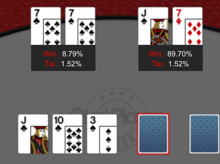 Fisken caller en $15 åbning. Jeg har 7♥7♠ og satser på at gå heads up med et 3-bet til $70. Kun fisken caller. Pot: $160