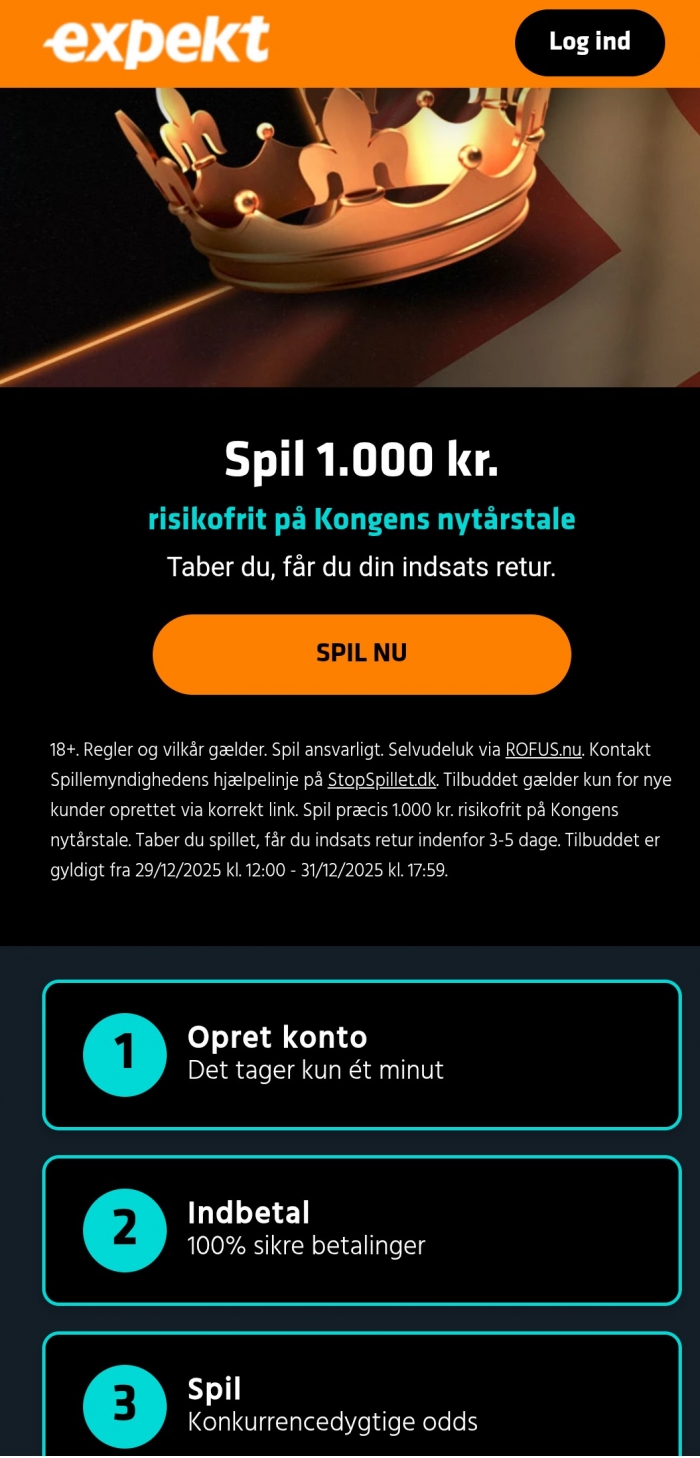 - Tilbuddet udløber 31. december 2025 kl. 17:59 - konto, indbetaling og væddemål skal være oprettet og på plads inden da