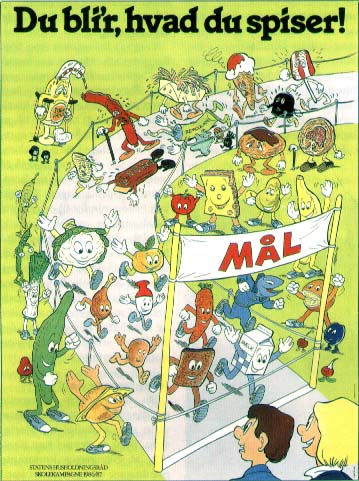 Jeg er nu 43 år gammel, men dengang jeg gik i skole husker jeg en plakat over sund / usund mad. Plakaten viste forskellige madvarer løbe om kap. Der var også en målstreg, og de sunde madvarer var fremme ved målstregen mens de usunde lå bagerst i løbet. Nogen der husker den og kan finde den frem? Har spurgt Chat GBT og Google uden hjælp.