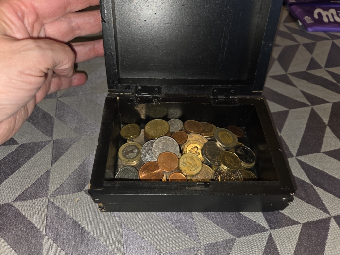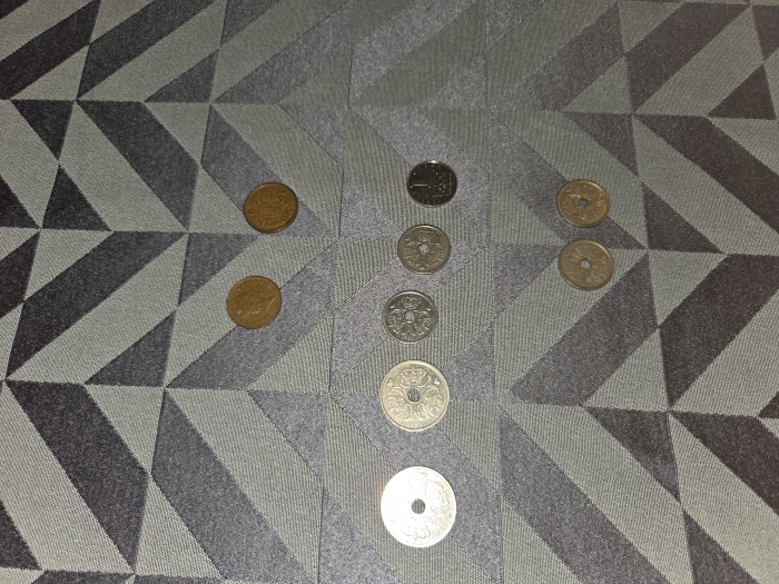 Først tænkte jeg, at det bare skulle være danske mønter, men måske mere interessant, hvis det er forskellige mønter, så nationalitet er ligegyldigt.