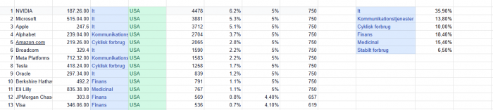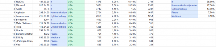 Nu da jeg har tjekket lidt nærmere, så ser det ud til beregningen går efter 13 de største markedscap aktier i indekset, som den så igen vægter efter markedscap blandt dem. Så vægtningen jeg har fået fra din side, viser hvordan sektorerne er repræsenteret blandt 13 de største aktier i MSCI World indekset. Giver også god mening at gå efter de aktier, som fylder mest i indekset, det kan jeg godt se. Virker bare til de aktier er ret homogene, så spørgsmålet er, om det bliver på bekostning af sharpe ratio man gør det, da diversificering ved at vælge andre sektorer og lande måske kan give samme afkast til lavere standard afgivelse.