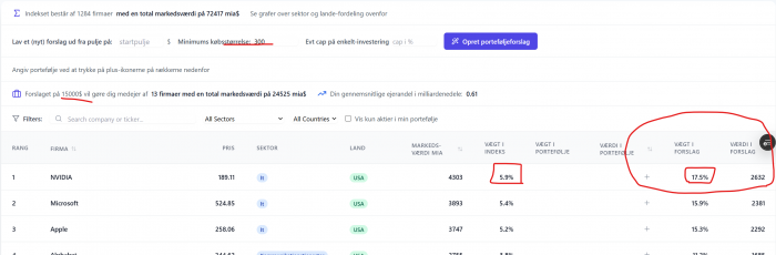 Den viser også hvor stor vægtningen vil blive i dit forslag kontra faktisk vægtning i indeks.