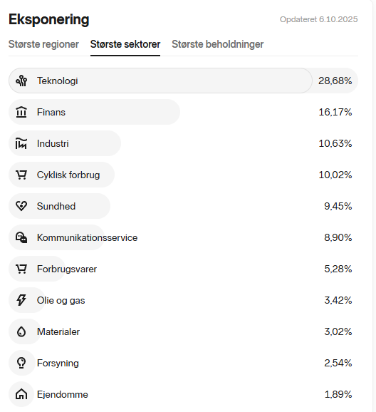 Hvis jeg f.eks. kigger efter 10 største sektorer for iShares Core MSCI World UCITS ETF USD (Acc), som jeg tænker repræsenterer rimelig godt MSCI World indekset, så er der rimelig stor forskel på sektorvægtningerne der og så dine: