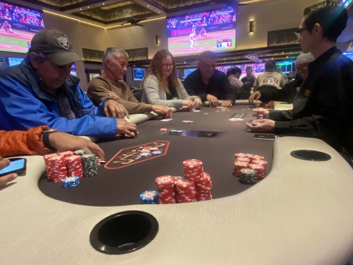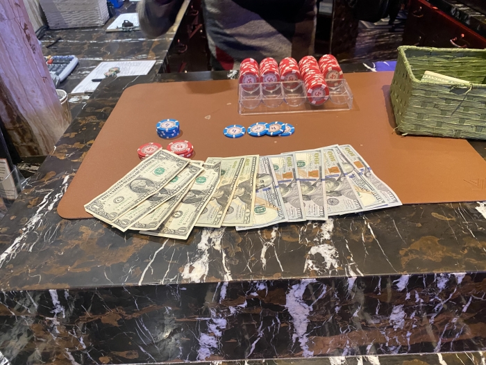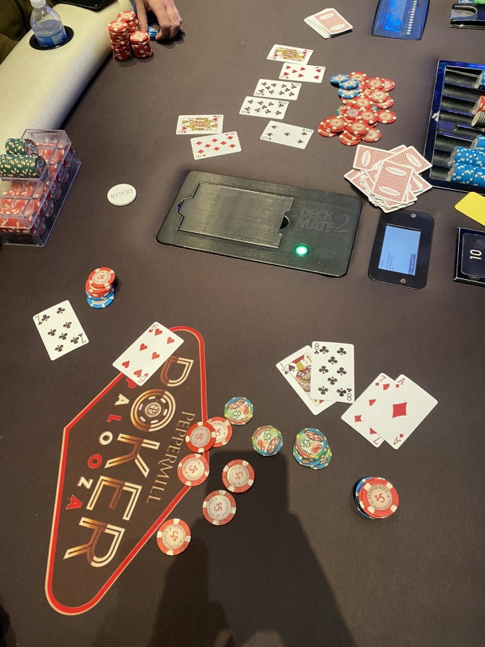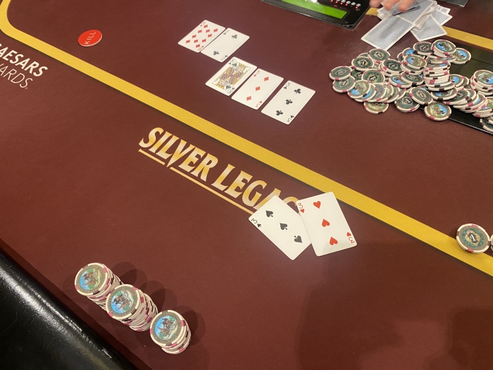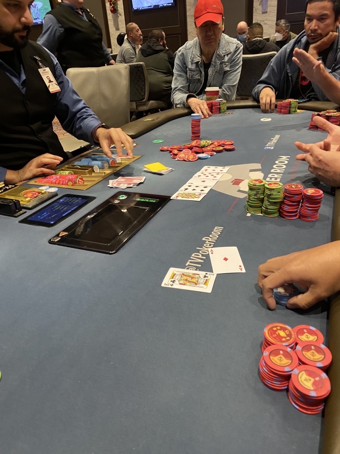 I min 4th dealt hand åbner jeg for 3. gang ud af 4 mulige. Alle hænder man skal åbne. Denne gang siger jeg $12 med A♣Q♣. Jeg får et enkelt call af en dame med punker hår. Pot: $28