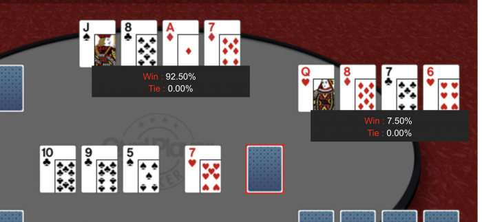 River: 7♣. Jeg sætter hende all in for sine cirka $100. Hun caller og mucker efter jeg har vist.