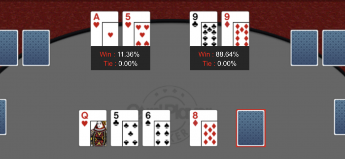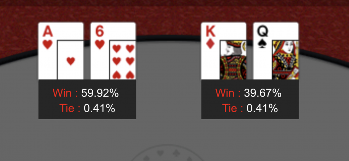 I next dealt hand er der to shoves. Jeg er small blind med 7♣6♣ og har en svær beslutning. Jeg har allerede investeret 22% af min stack som smal blind. Min hånd er god multiway. Hvis jeg har 33% chance er det et break even spil. Hvis jeg vinder er jeg rent faktisk tæt på de 232K jeg havde før min AK fadæse. Jeg ender med et call. Procenterne var som jeg håbede på.