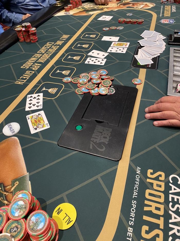 Der er ingen som ryger ud. I min 4. hånd siger jeg fuck it og smider min 5K chips ind med AA. Alle folder underligt nok så skal bare igennems big blinds K♣4♠. Det lykkedes og jeg 5 doblede min stack med anter og blinds. Der ryger kort efter en spiller mere.