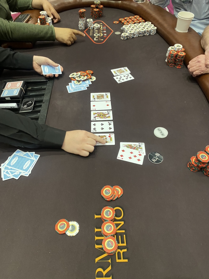 Jeg åbner til 15K med T♥T♦. Chippie som har spillet passivt caller. Der foldes rundt til min højremand som shover med samme stack som min. Jeg tager 90 sekunder i tanken og ender med et fold. Chippie caller med JJ og holder mod den andens AK.