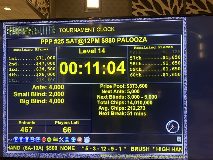 De $25K gtd blev næsten tripplet til en samlet præmiepulje på $70K. Med 276 entrants var der $15K på toppen og præmier til top 35.