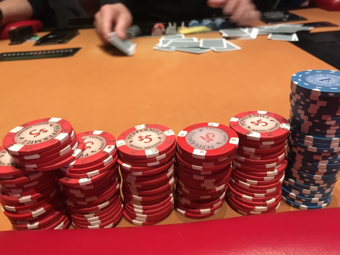 Jeg taber flippet og booker et win på $324 minus de $65 fra buy in.