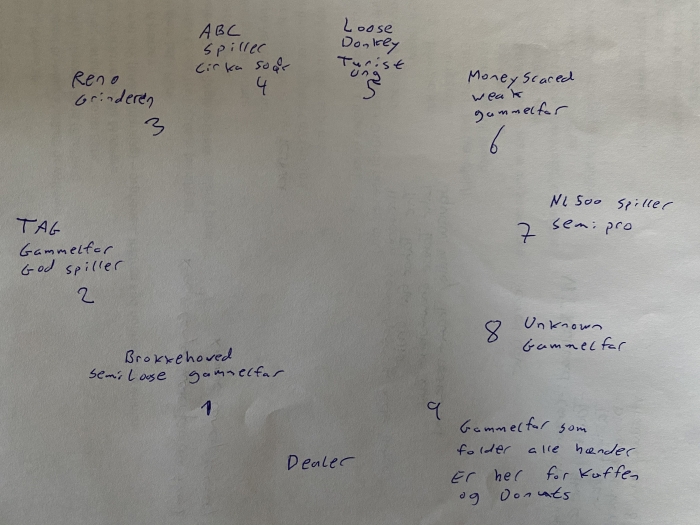 Jeg folder den første hånd. Vi er 7 handed. Næste hånd er jeg UTG. BB er ikke kommet tilbage endnu. Jeg skubber ubeset og bliver kaldt af god spiller i SB. Han vender KJoff og jeg har en Doyle som misser.