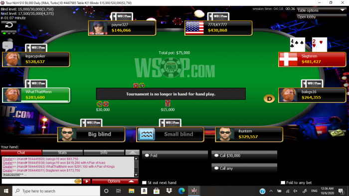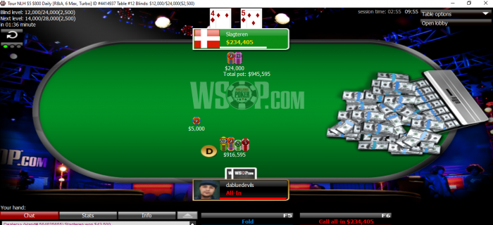 Turn: T♥. Godkendt kort! Jeg aner faktisk ikke hvad det rigtige move er her. Jeg skubber og han folder efter et par sekunder. Lowstacken har K9off og river bricker.