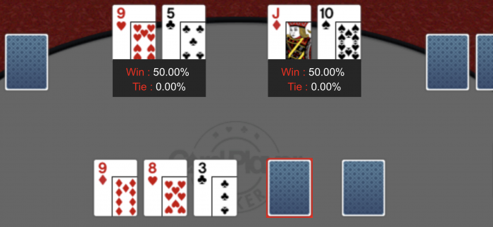 Turn: J♠. Jeg better nødden med $30. Han clicker til $60. Han er en ældre asiat og har ham ikke på typen som bluffer meget. Jeg går ud fra vi har samme hånd så jeg blev glædeligt overasket da han begynder at klage sig over mit raise til $160 og caller!!!