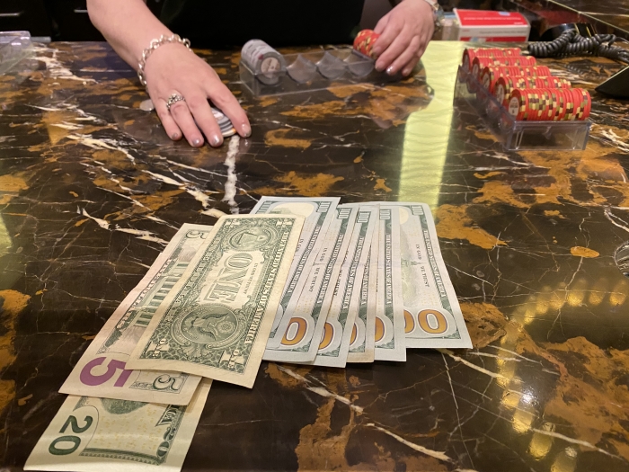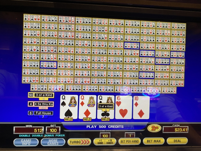 Flop: 4♣4♦5♦. Jeg tænker at dette er min 4. bonushånd i træk jeg intet får ud af. Jeg fik 2 gange quads på Peppermill den måned de kørte uden bonus lige efter COVID lockdown. På Atlantis fik jeg quads med $9 i potten og minimum er $10. Det er kun highhand og RSF der giver bonus på Graton så det blev heller ikke 4. gang......Good times! Jeg checker og caller gamles kinesers $30 bet som den eneste. Pot: $90