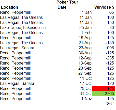 River: J♠. Ikke det bedste kort da de godt kan have KJ. Jeg skubber alligevel all in og de caller begge....Meximor har K9 off og den gamle kinser som tog mit sæde har Royal Straight flush med Q♠T♠. Udover $800 puljen vinder han $500 for high hand og $1500 mere for progressive RSF bonus. Jeg har på dette tidspunkt mest lyst til at køre tilbage til Reno og aflyse min tur men jeg køber alligevel ind for $300 mere. Rimeligt godt valg han fik lavet der med at tage mit sæde....