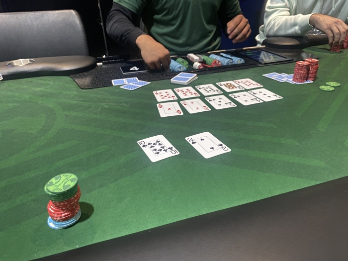 River: Q♦. Jeg vender og spørger dealeren om vi chopper til hans JT? Svaret var nej.