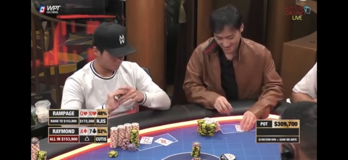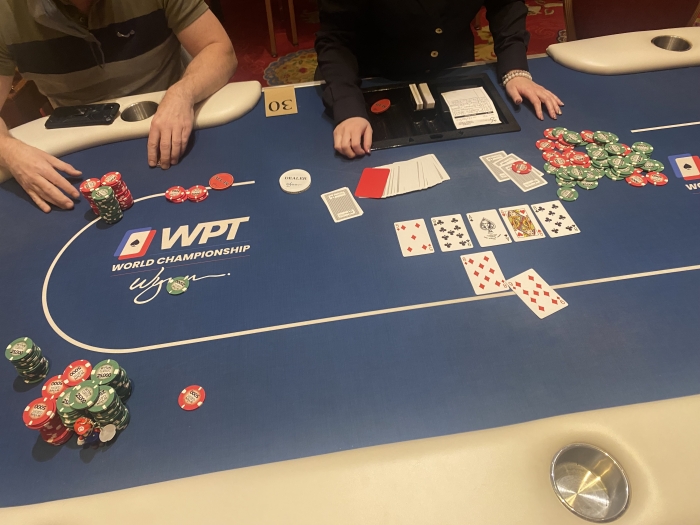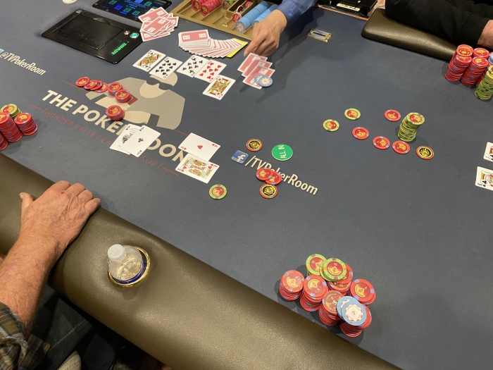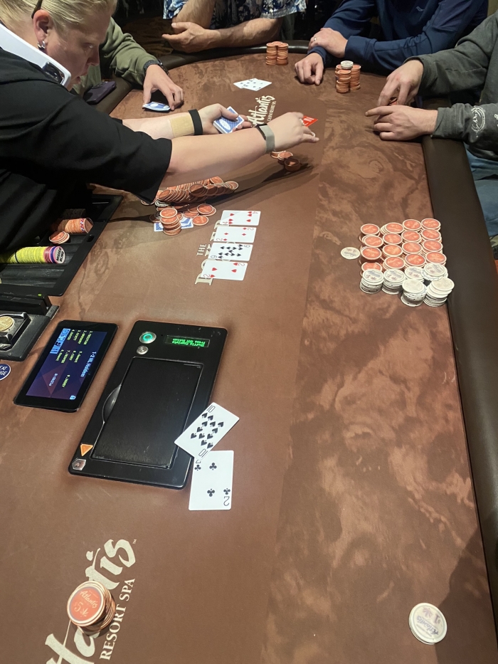 Rookiefisken forlader bordet men kommer tilbage 10 minutter efter med $200. Han får et nyt sæde direkte på min højre side. Han fistpumper mig og siger good hand. What a dream spot!