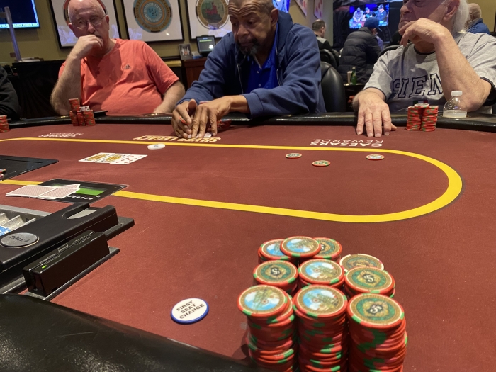 Turn: 7♥. Jeg håber de har et nøgent es. Jeg siger $40 men kunne nok godt have sizet højere. En enkelt af bukkene falder fra. Pot: $134