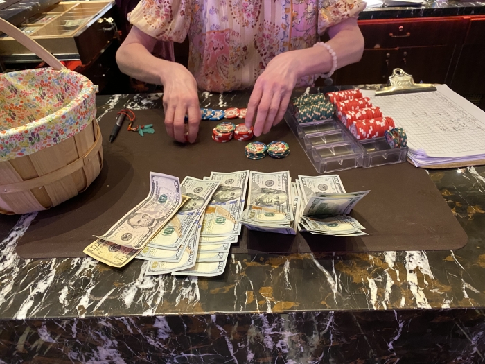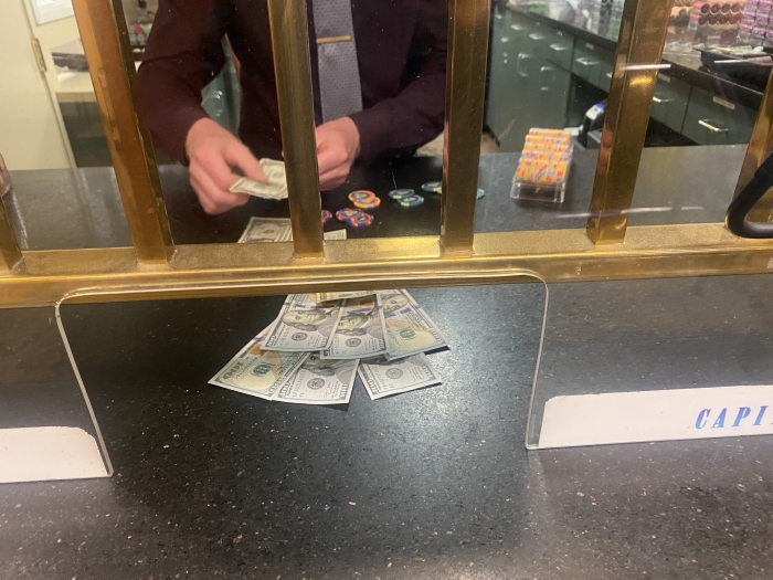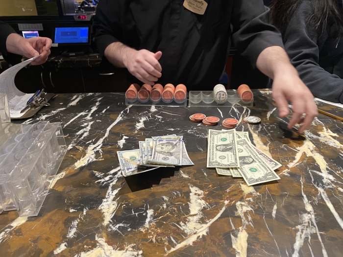 Wise guy åbner til $7 UTG. Han sizer typisk efter hand strentgh. Der kommer to calls. Jeg er big blind og raiser til $42 med T♦4♣. Wize guy går dybt i tanken og eyeballer mig. Han ender med et fold. De andre snap folder.