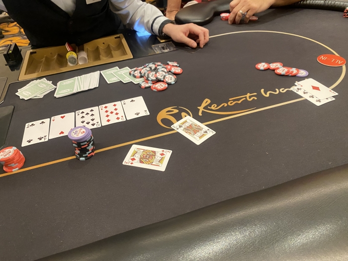 River: A♠. Han shover. Jeg folder selvom jeg stadig nemt kan være foran. Jeg viser og han mucker.