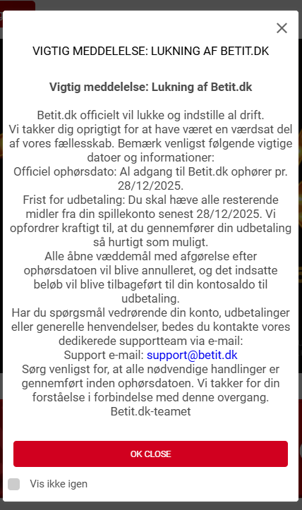 OPDATERING: Betit lukker den 28. december 2025. Vi anbefaler, at du udbetaler evt. indestående inden da.