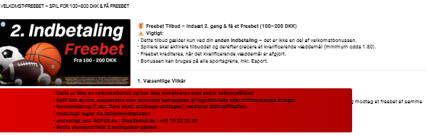 Derudover får du hver mandag et freebet på 100 kr., hvis du i ugen forinden har spillet for 300 kr. eller derover til min. odds 1,80.