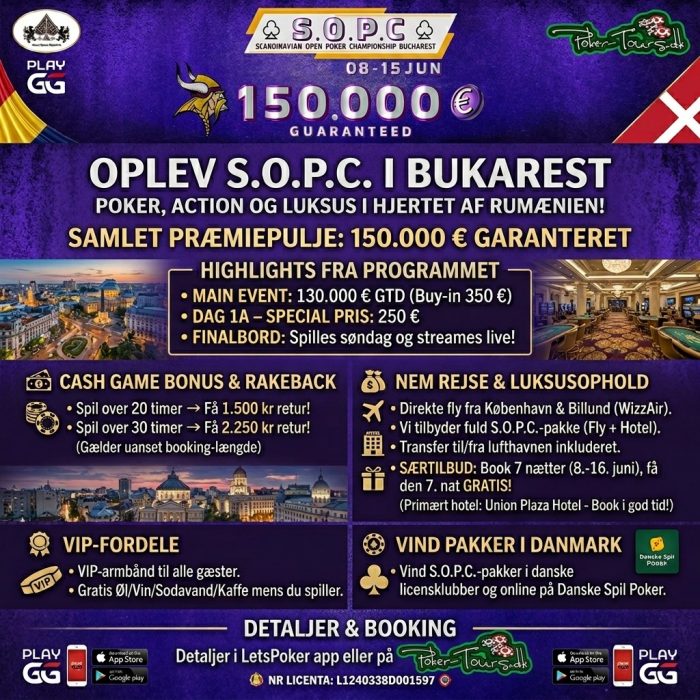 Tag med til S.O.P.C Juni 2026 Bukarest i Rumænien, hvor der afholdes en actionpacked main event turnering med €130.000 GTD 🏆