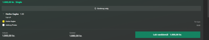 Hawkeye skrev: Jeg tror jeg har brændt mine broer der 😃 Jeg kan stadig spille 1.000 kr pr spil på 888, Spreadex og Danske Spil, og hvis det holder er jeg godt tilfreds med dem. Følger en dart tipster, og der kan jeg få mine spil ind til fine priser på de to første. Alt det andet er som udgangspunkt på børsen.