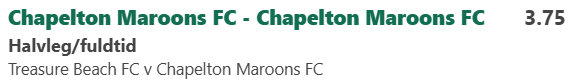 Treasure Beach FC - Chapelton Maroons FC Tabt (-5 units) HT / FT ... Chapelton Maroons FC / Chapelton Maroons FC @ odds 3.75 5 / 5 Bet365 Fodbold - 01/01-2026 21:00