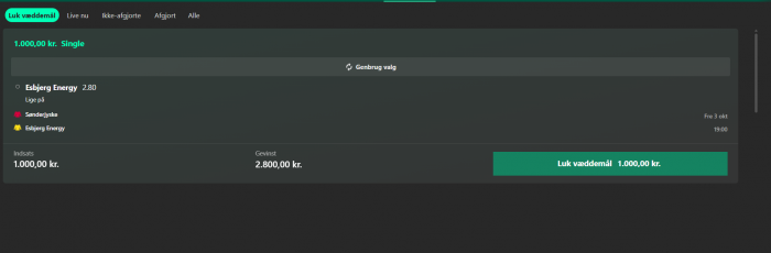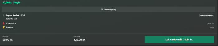 Bet4Value skrev:Har lige spottet, at Betit også har odds 8.50 på Kudsk kort. Så hvis man enten ikke er nået med hos 365, eller hvis man har spillet hos 365 og ønsker at sælge med profit, så kan man gøre det og i stedet gå ind hos Betit. Bemærk dog at Betit har forholdsvis lave limits, hvis man vælger at lave det stunt.